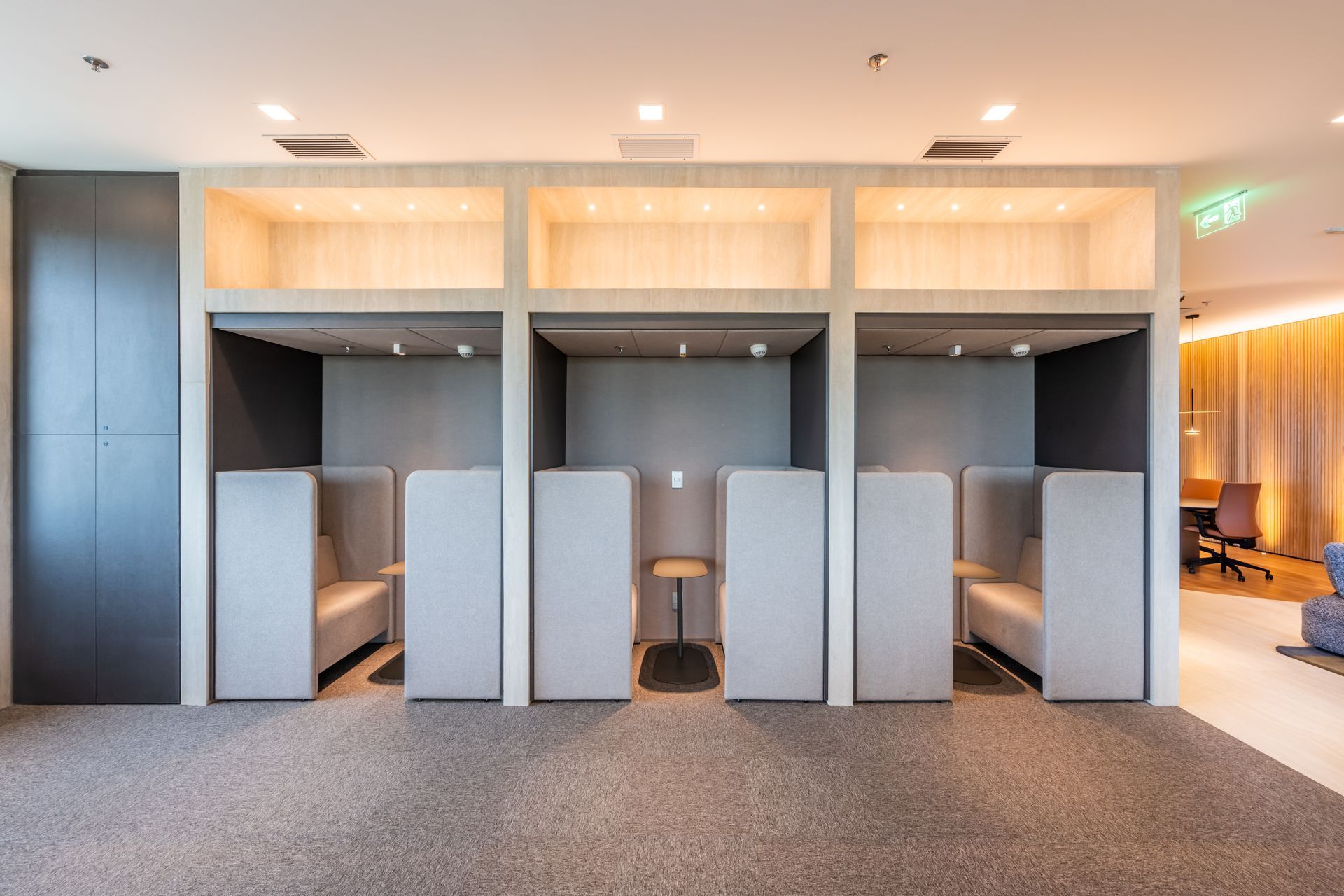 Para equilibrar integração e foco, o layout cria uma separação entre o lounge e a área de operação, com estações de trabalho e sala de reuniões. Na frente de produção, o andar reúne estúdio para podcast, além de cabines com três posições para narrador e comentaristas, preparadas para câmera robótica no pré‑jogo, intervalo e pós‑jogo. Todo o conjunto recebeu tratamento acústico, garantindo isolamento entre ambientes e consistência de áudio com cabines de mesma estrutura e variações de tamanho conforme a produção.
