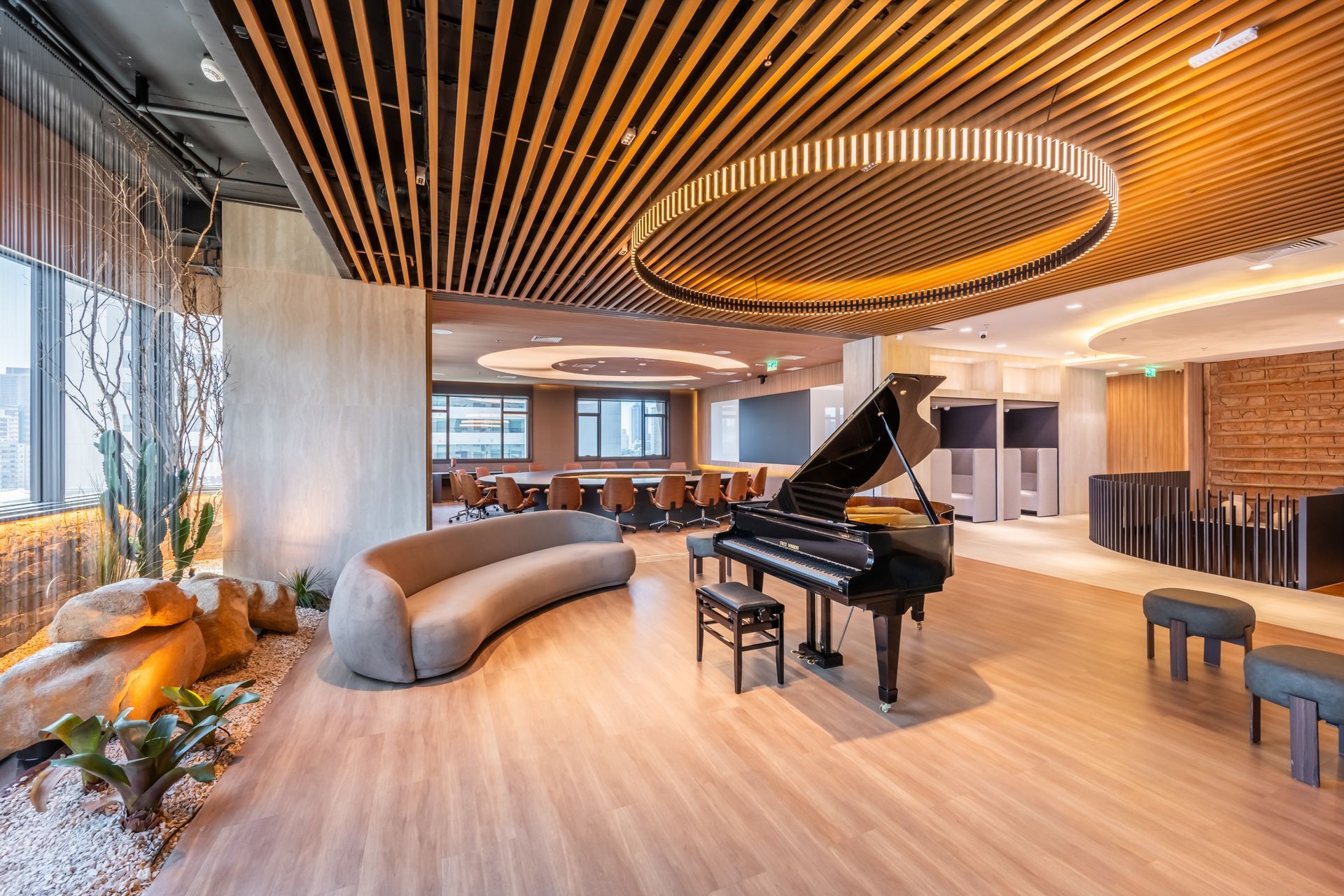 O 7º andar foi projetado para ser um espaço de representação e estratégia, preparado para receber clientes, parceiros e lideranças. O pavimento reúne um grande living integrado ao jardim com cortina de água, além de elementos que constroem uma atmosfera sofisticada e acolhedora, com bar e piano. Materiais como madeira, a presença de elementos naturais e o uso de luz quente consolidam uma linguagem humanizada.