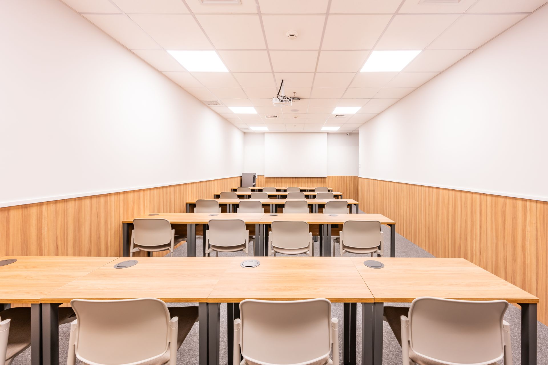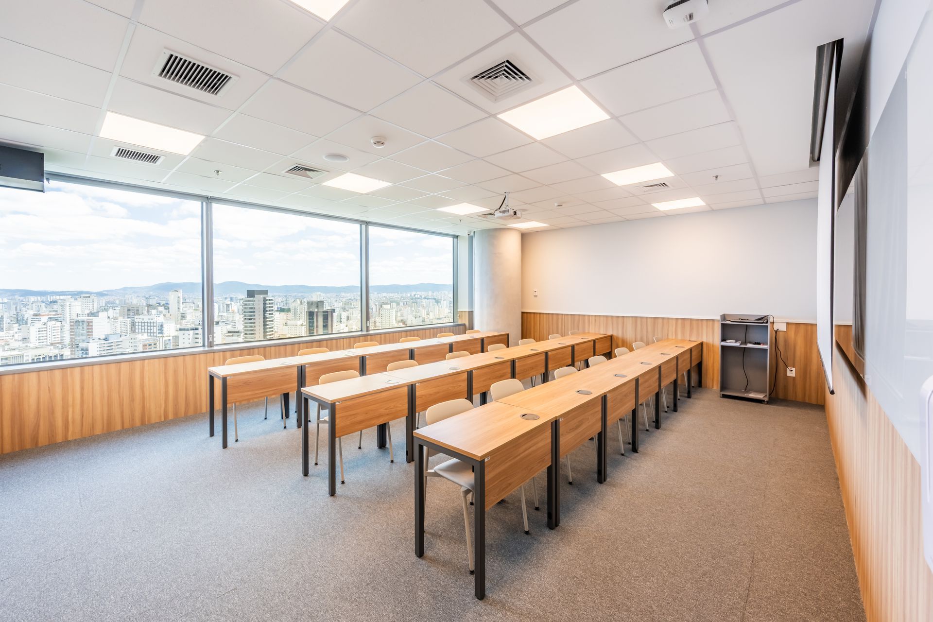 - Cinco salas de aula com capacidade para 80 alunos, projetadas com acústica otimizada