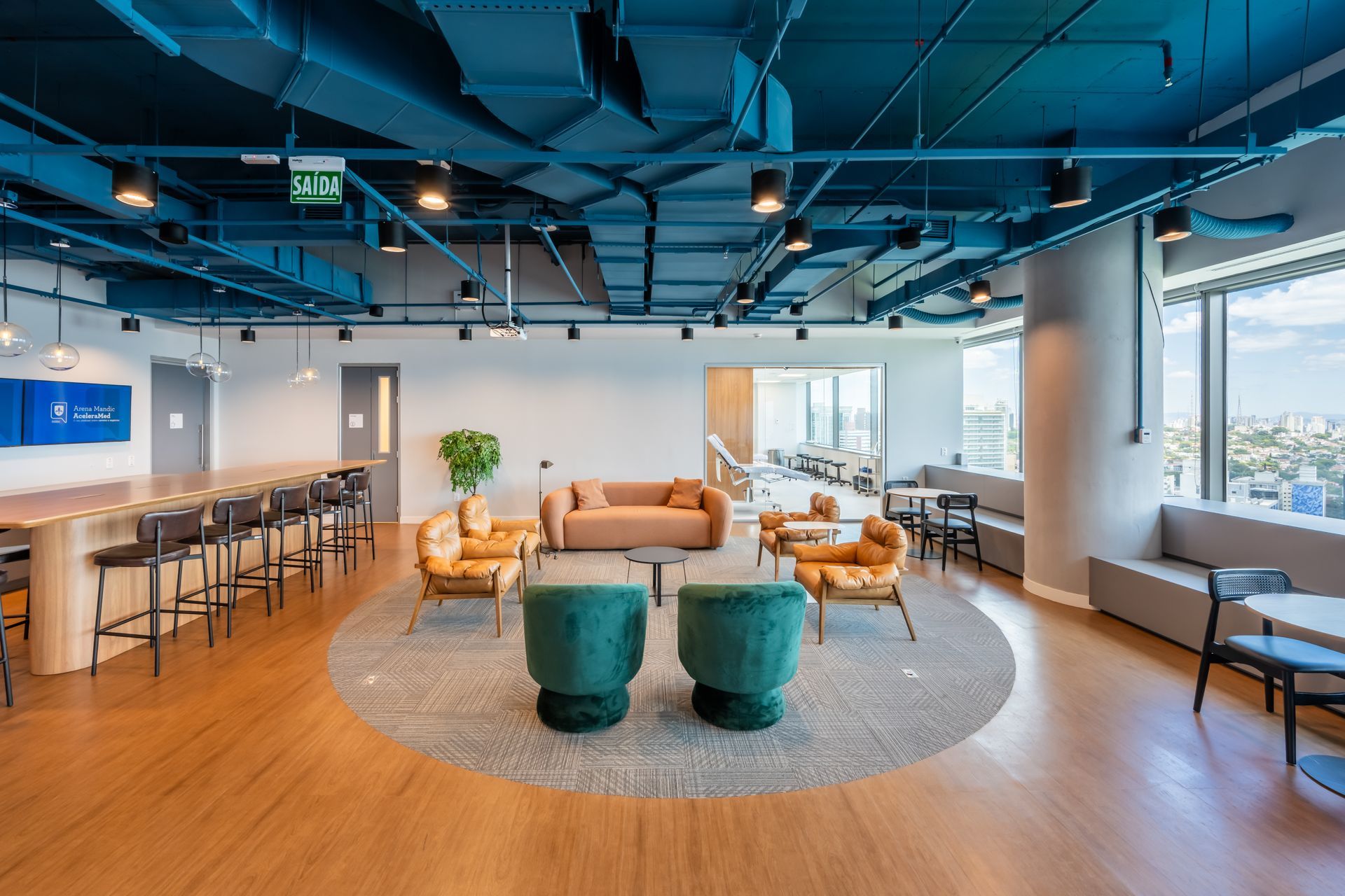 - Amplo espaço de convivência com arquibancadas, poltronas e puffs - elementos que reforçam a premissa humanizada da instituição e promovem integração entre os times